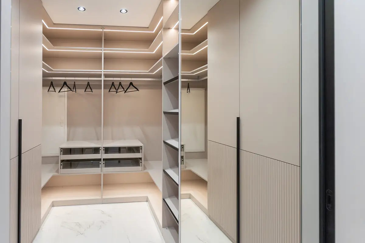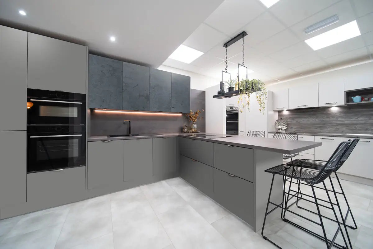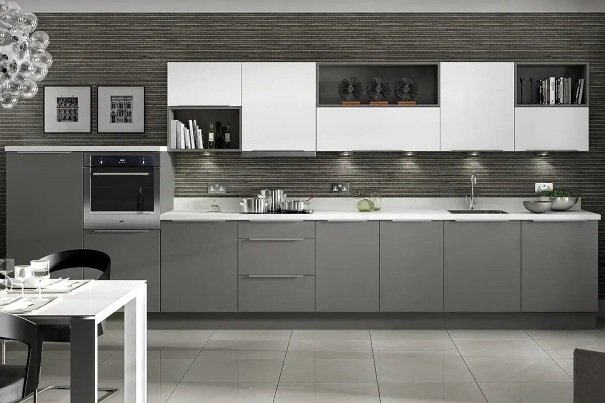 Flat-panel cabinets | Handle-less design | Matte finishes | Neutral tones